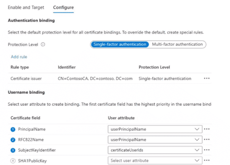 You enable and target certificate-based authentication as shown in the Enable and Target