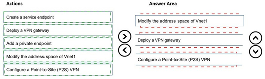 Which three actions should you perform in sequence before you can integrate WebApp1 and Vnet1? To answer, move the appropriate actions from the list of actions to the answer area and arrange them in the correct order.