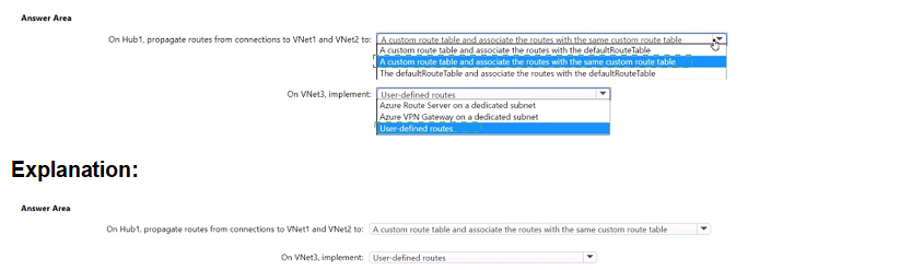 On Hub1, propagate routes from connections to VNet1 and VNet2 to a custom route table and associate the routes with the same custom route table → Correct