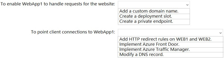 Add HTTP redirect rules on WEB1 and WEB2: This would redirect traffic from the on-premises servers, but it does not configure the Azure App Service itself to handle the requests. Migration requires pointing clients directly to Azure.