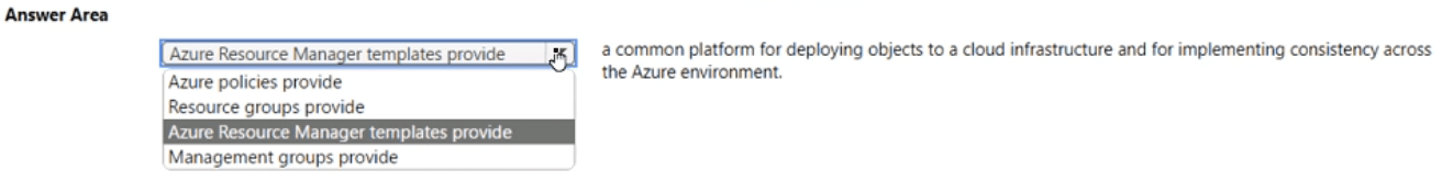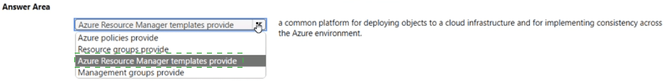 This question tests the purpose and primary benefit of Azure Resource Manager (ARM). ARM is the underlying deployment and management service for Azure. It provides a consistent management layer that enables you to create, update, and delete resources in your Azure subscription. The key phrase is "common platform for deploying objects" and "implementing consistency."