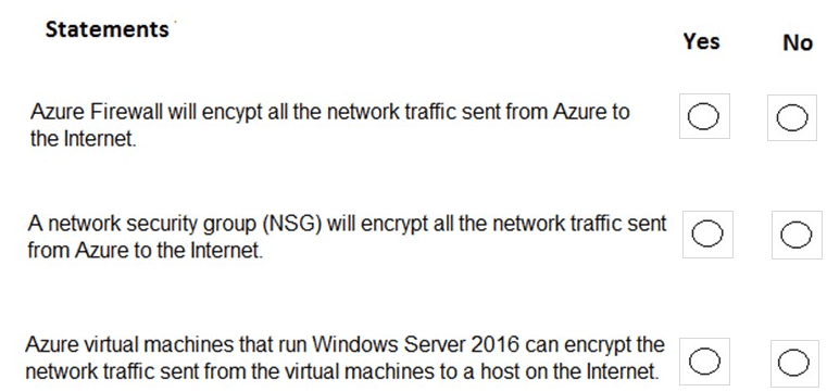 This question tests the encryption capabilities of various Azure networking and compute services. Encryption in transit is typically provided by higher-layer protocols (like TLS/HTTPS) or specific VPN/IPsec tunnels, not by standard network filtering or firewall services themselves.