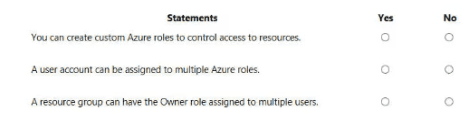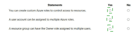 Selecting "No" for any of these statements would be incorrect. All three statements describe core, flexible capabilities of the Azure RBAC system that are essential for complex access management scenarios.