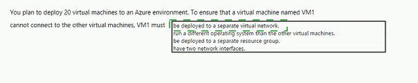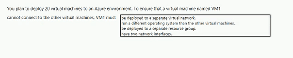 This is the correct answer. Virtual networks (VNets) in Azure are isolated network environments. By default, VMs in one VNet cannot communicate with VMs in a different VNet. Deploying VM1 to its own VNet provides immediate network-level isolation from the other VMs (which would be in another VNet). Without VNet Peering, a VPN Gateway, or other explicit connectivity, no traffic can flow between them.