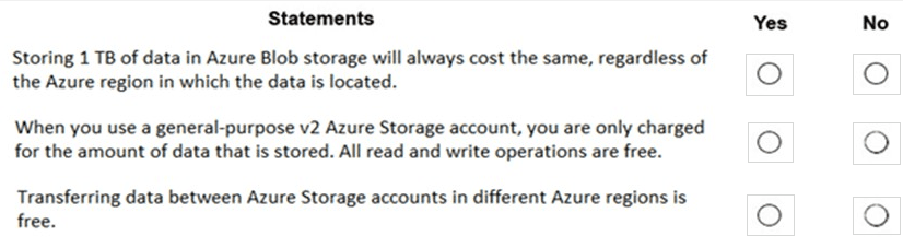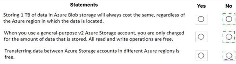 Selecting "Yes" for any of these statements would be incorrect, as each one contains a fundamental misunderstanding of Azure Storage pricing components.