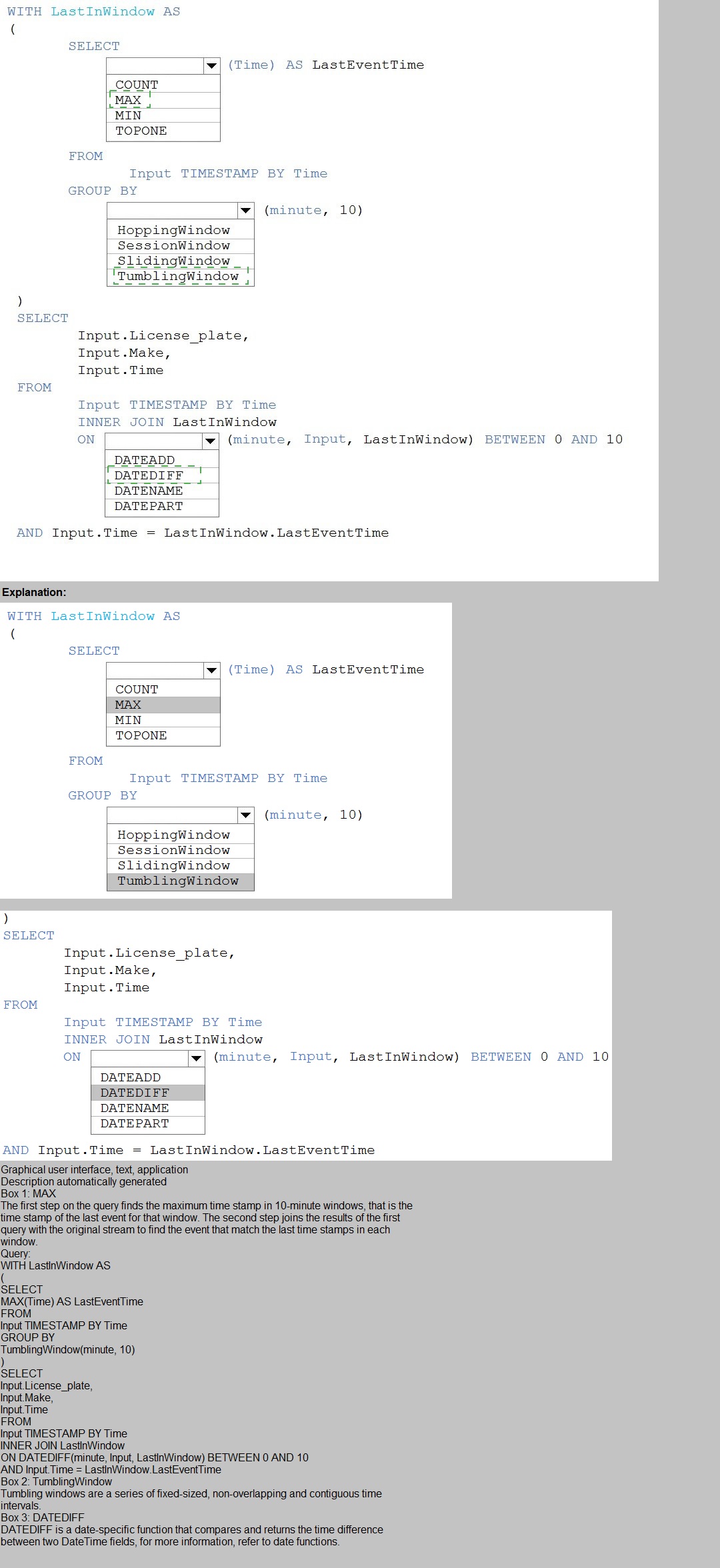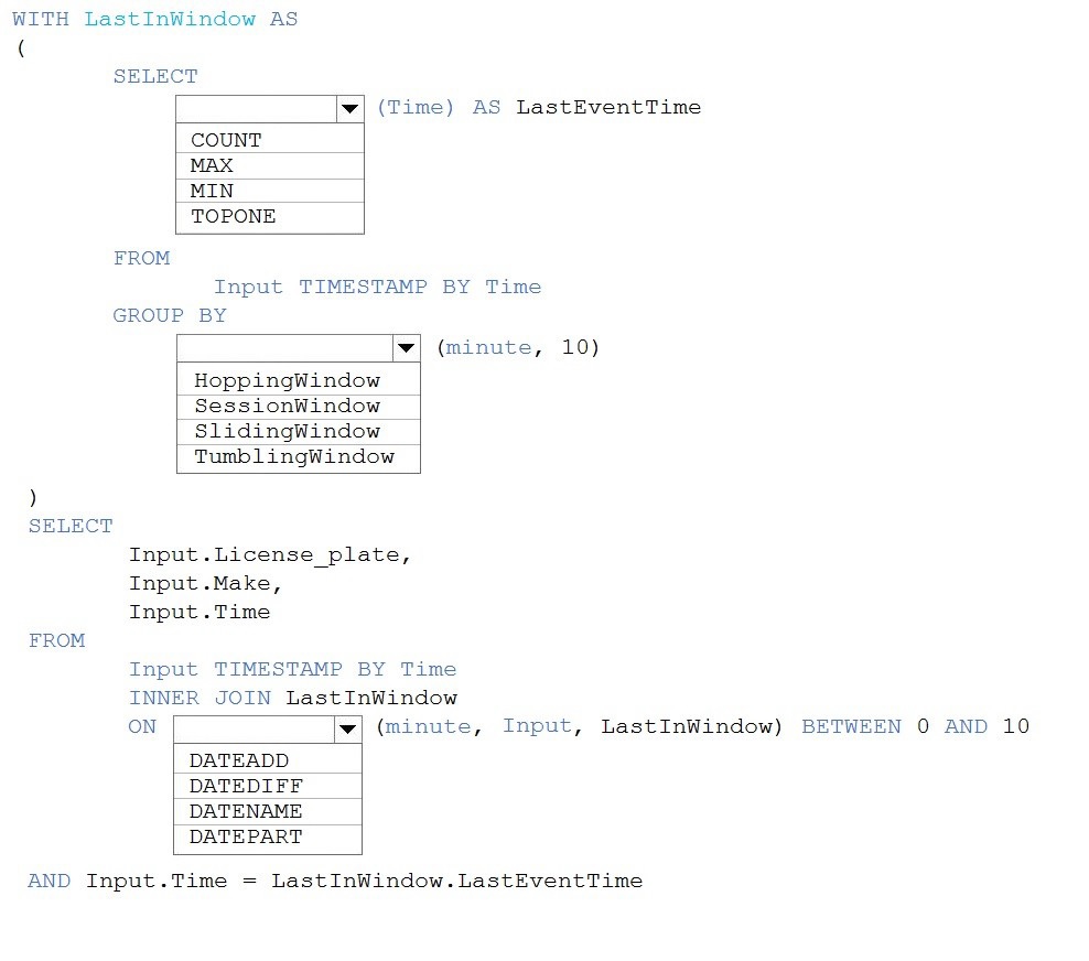 You need to use Azure Stream Analytics to return the license plate, vehicle make, and hour the last vehicle passed during each 10-minute window.
