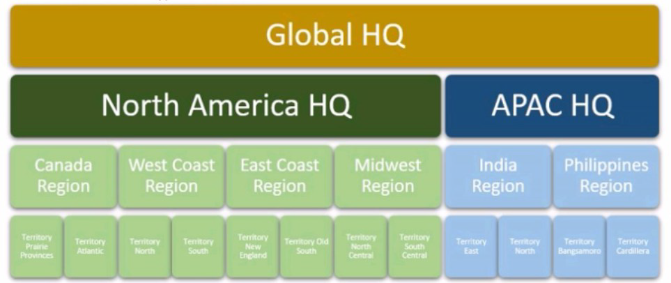 Contoso has main offices in North America. Europe and Asia, with global headquarters based in Redmond, Washington, USA. Each of the regional offices has their own sales and service teams. The regional HQ locations also include sales and services leaders and executive management. Global HQ houses company executives for various departments, including sales and service.