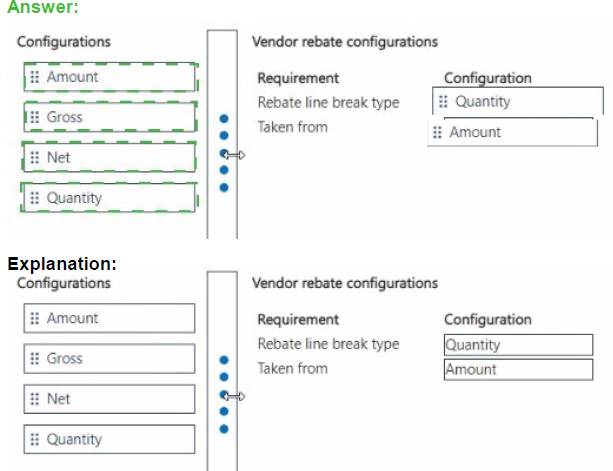 The question requires configuring vendor rebate parameters for correct calculation of vendor claims. In Dynamics 365, vendor rebates require configuration of both the break type (how rebate tiers are structured) and the basis for calculation (what value the rebate is taken from). The available options include Amount, Gross, Net, and Quantity.