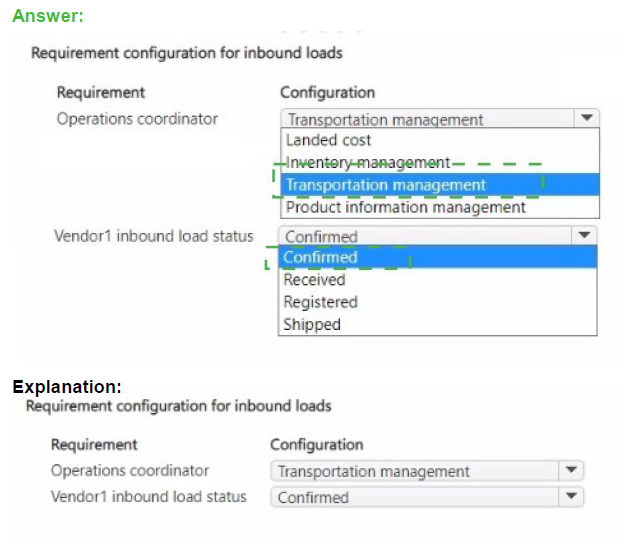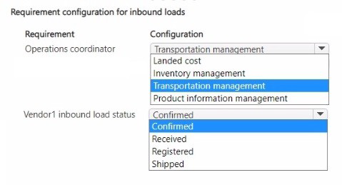 The question requires matching configurations to specific requirements for an operations coordinator and Vendor1's inbound load status. The table shows different Dynamics 365 modules (Transportation management, Landed cost, Inventory management, Product information management) and inbound load statuses (Confirmed, Received, Registered, Shipped). The correct configuration must align with coordinator responsibilities and load tracking needs.