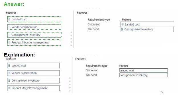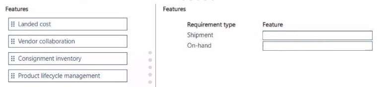 The question requires matching Dynamics 365 features to specific requirement types for VendorC: Shipment and On-hand. Different vendor collaboration and inventory management features address different aspects of the vendor relationship. Shipment requirements typically involve tracking and managing incoming goods, while on-hand requirements relate to inventory ownership and availability.