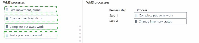 This drag-and-drop question evaluates knowledge of the typical sequence of actions a warehouse operator performs in Dynamics 365 Supply Chain Management using the Warehouse Management mobile app after completing core warehouse work such as receiving or movement. The focus is on finalizing placement of inventory and preparing it for operational use. In standard WMS flows, the operator first completes the directed put-away work to physically move items to the correct storage location, then changes the inventory status to make the stock available (or blocked/quality-held as required). Other journal-based processes are not the immediate next steps in this context.