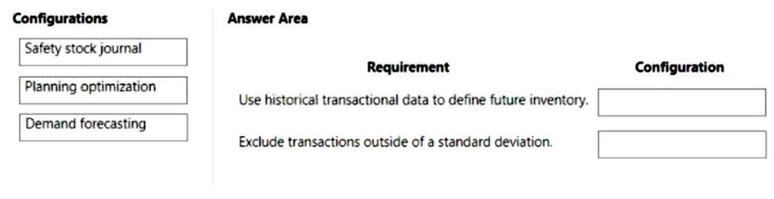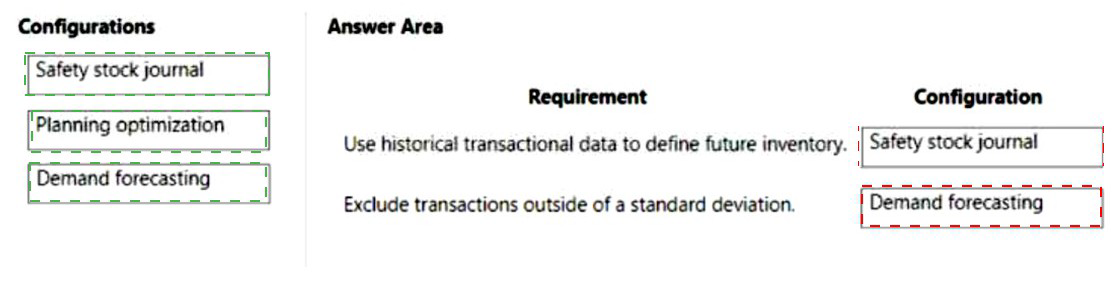 The question involves using historical transactional data to forecast future inventory needs while excluding outliers beyond a standard deviation. In Dynamics 365, Demand forecasting analyzes historical data to predict future demand. This feature includes statistical methods to identify and exclude outliers, ensuring forecast accuracy by removing anomalous transactions.