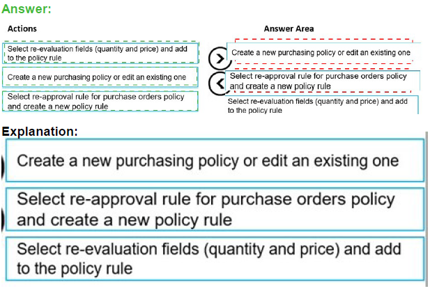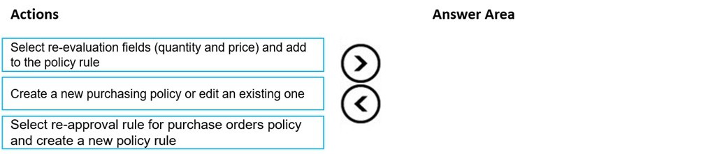 The question requires configuring purchase order change management to require re-approval only for specific field changes (quantity and unit price). In Dynamics 365, this is achieved through purchasing policies and policy rules that define which field changes trigger re-approval. The configuration follows a logical sequence of accessing policies, creating rules, and defining the triggering fields.