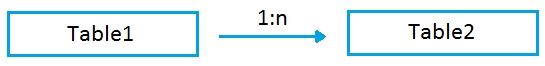 The exhibit shows a 1:n (one-to-many) relationship where Table1 is the primary table (one side) and Table2 is the related table (many side). The requirement is to prevent deletion of records from Table1 if any related records exist in Table2. This is a referential integrity constraint that must be configured through the OnDelete property of the relation on Table1.