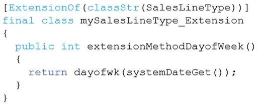 This is correct because while the class structure is right, the method name is incorrect. In X++ extension classes, new methods must be decorated with an attribute or follow a specific naming convention to be accessible. The method should be named with the class name prefix pattern like SalesLineTypeExtension.DayOfWeek(). Additionally, the method should be static or properly implemented to be called from the extended class context. The given method returns the day of week but cannot be called as SalesLineType.extensionMethodDayOfWeek() from outside.