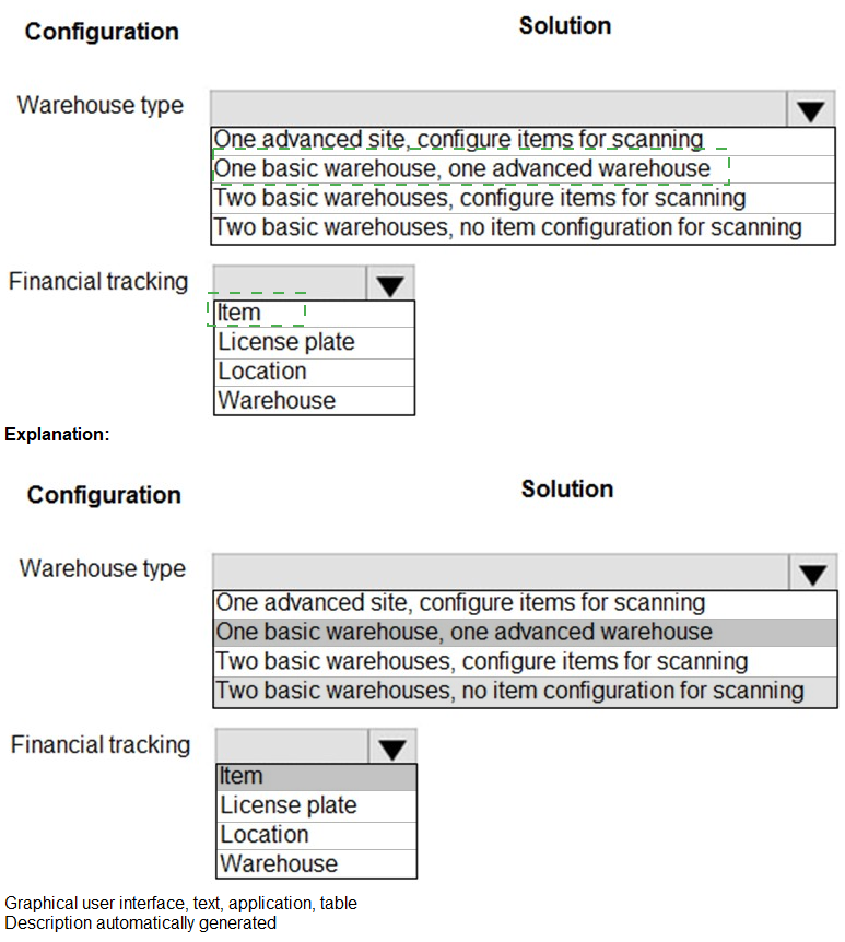 This question tests your knowledge of warehouse configuration options in Dynamics 365 Supply Chain Management, specifically regarding warehouse types (advanced vs. basic) and financial tracking dimensions. The solution requires matching the appropriate warehouse type configuration and financial tracking level to meet specific business requirements that would be described in the scenario.