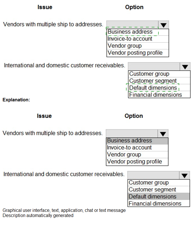 This question tests your knowledge of master data configuration in Dynamics 365 Finance, specifically regarding vendor and customer setup options. The issues described require understanding which data elements control specific functionality: vendor ship-to addresses and customer receivable segmentation.
