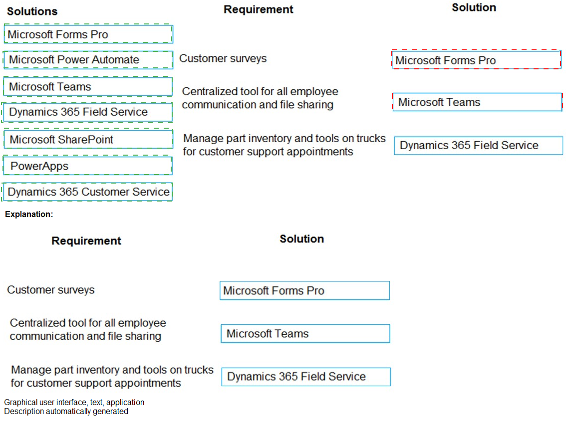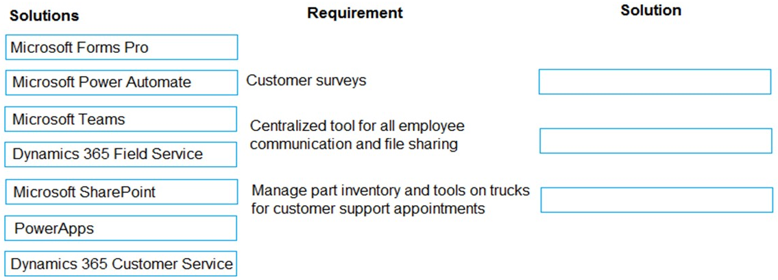 This question tests your knowledge of Microsoft business applications and their appropriate use cases for different business requirements. City Power and Light needs three distinct capabilities: gathering customer feedback, enabling employee communication and file sharing, and managing field service inventory. Each requirement maps to a specific Microsoft solution designed for that purpose.
