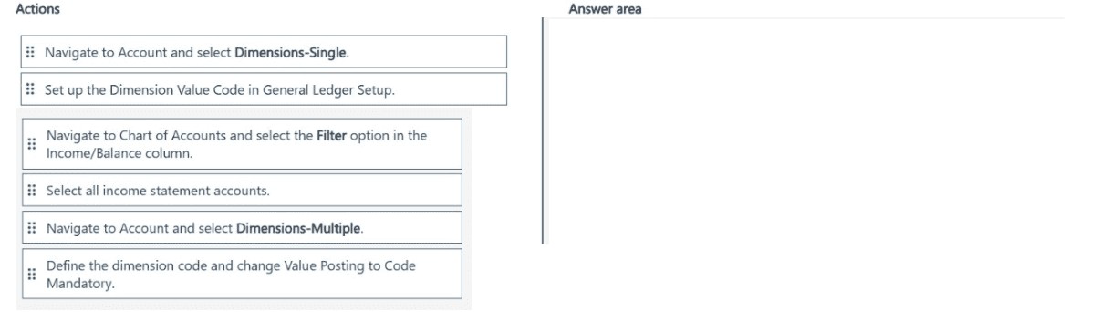 Navigate to Account and select Dimensions-Single: This applies dimension settings to one account at a time, not to all income statement accounts at once. The requirement specifies "all at once."