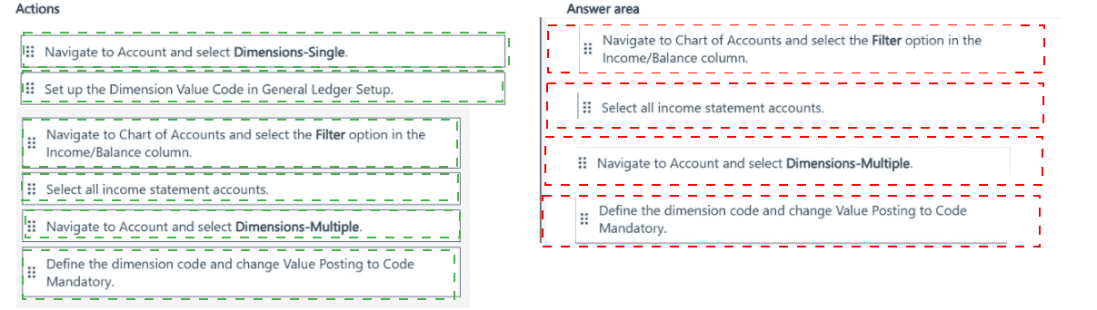 Define the dimension code and change Value Posting to Code Mandatory (without selecting accounts first): This action alone would apply to no specific accounts. The sequence requires selecting accounts before defining mandatory settings.