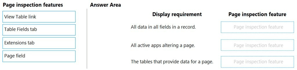 Which features should you use? To answer, drag the appropriate page inspection features to the correct display requirements. Each page inspection feature may be used once, more than once, or not at all. You may need to drag the split bar between panes or scroll to view content.