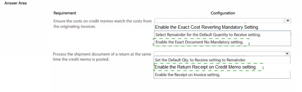 Explanation: When this setting is enabled, Business Central requires that return orders (credit memos) revert the exact original cost from the originating invoice rather than using the current average or standard cost. This ensures cost matching for accounting accuracy, especially when inventory valuation changes over time.