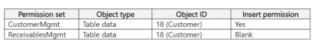 The CustomerMgmt permission set explicitly grants Insert = Yes on the Customer table (ID 18). This permission allows the user to create (insert) new customer records. Because Yes is a positive grant and Blank means no explicit permission (implicitly deny unless granted elsewhere), the Yes from CustomerMgmt takes precedence and enables customer creation.