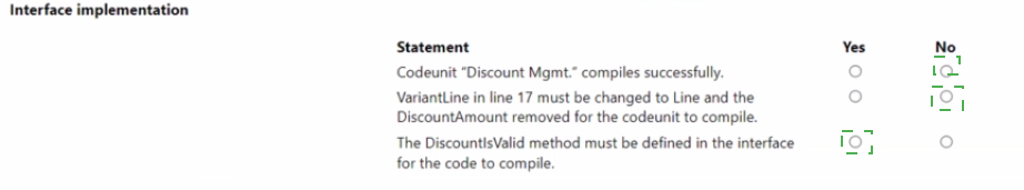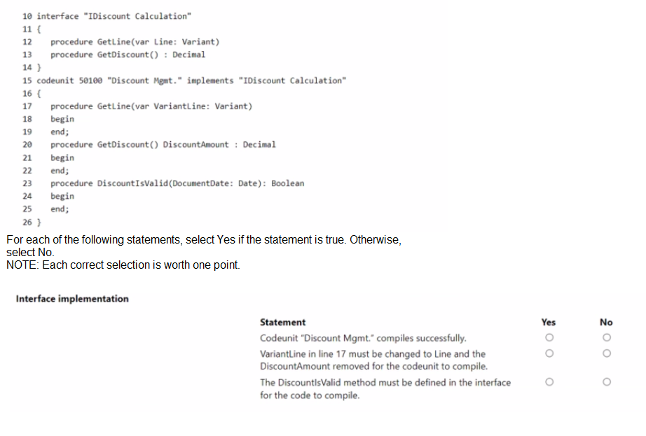 This statement is false. A codeunit implementing an interface may contain additional methods beyond those defined in the interface. The DiscountIsValid method is an extra method not defined in the interface, and this is perfectly valid. Only the methods defined in the interface must be implemented; additional methods are optional and allowed.