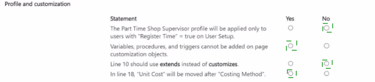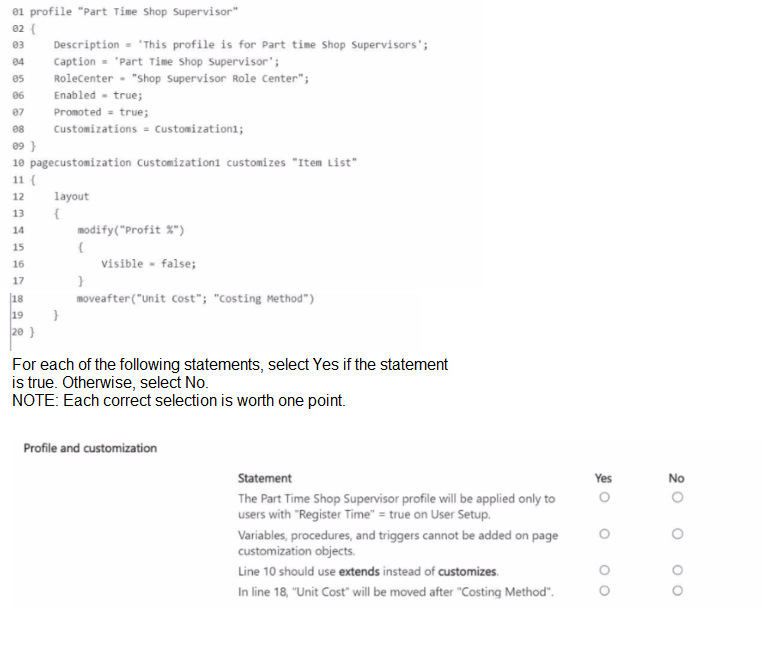 This question tests your understanding of Profile and PageCustomization objects in AL. Profiles define user roles and role centers. PageCustomization objects modify page layouts without extending the page object itself. They have specific syntax rules and limitations.