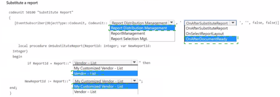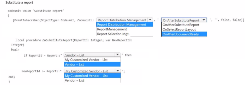 The OnAfterSubstituteReport event includes a var NewReportId: Integer parameter. By changing this value, you redirect the report request to your custom report ID. The condition checks ReportId and assigns NewReportId to your custom report.
