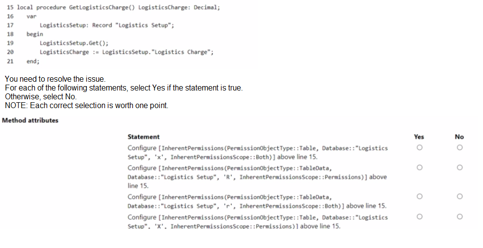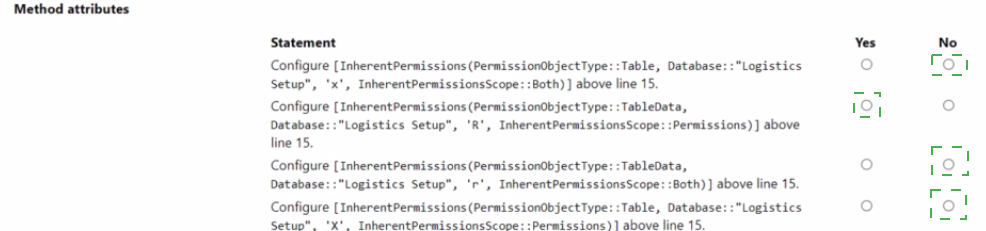 Configure [InherentPermissions(PermissionObjectType::Table, Database::"Logistics Setup", 'x', InherentPermissionsScope::Permissions)] above line 15.– No