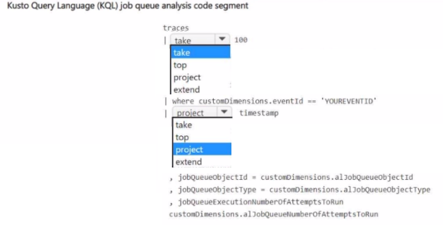 This Kusto Query Language (KQL) question tests your ability to filter and project telemetry data from Application Insights for Business Central job queue analysis. You need to filter traces for the specific job queue event ID, then project relevant timestamp and job queue custom dimensions for troubleshooting.