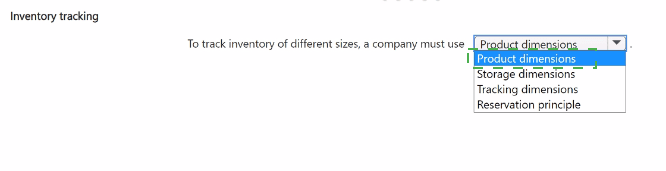 This is the precise answer. Product dimensions are attributes that define the variants of a product. The standard product dimensions are Size, Color, Style, and Configuration. To track inventory for "different sizes," you must enable and use the Size product dimension. This allows you to have separate inventory records for, e.g., Shirt-Small, Shirt-Medium, and Shirt-Large.