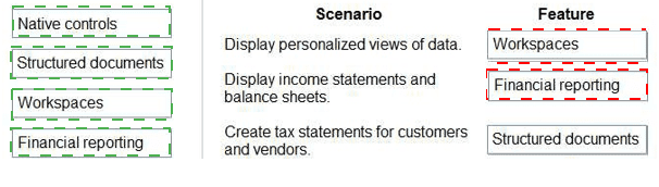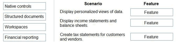 This question requires matching the correct reporting or display feature in Dynamics 365 Finance to its described scenario. It distinguishes between interactive analytical views, formal financial statements, and regulatory tax documents.