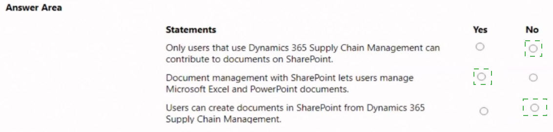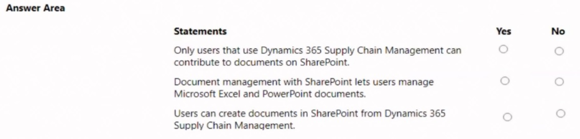 A company implements Dynamics 365 Supply Chain Management. The company uses Microsoft SharePoint Online for document management. For each of the following statements, select Yes if the statement is true. Otherwise, select No. NOTE: Each correct selection is worth one point.