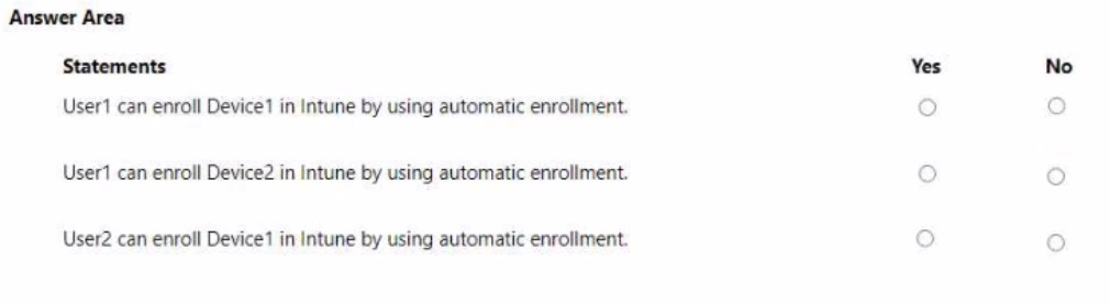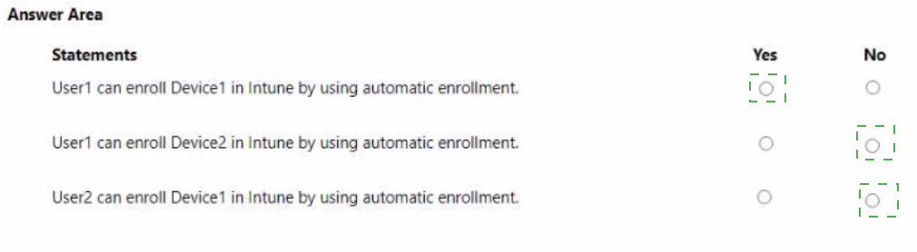 Statement 3: User2 can enroll Device1 in Intune by using automatic enrollment. → No