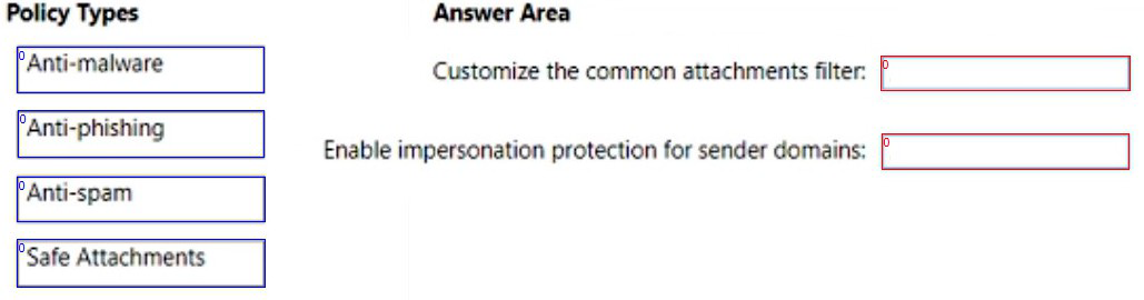 Which type of policy should you configure for each requirement? To answer, drag the appropriate policy types to the correct requirements. Each policy type may be used once, more than once, or not at all. You may need to drag the split bar between panes or scroll to view content.