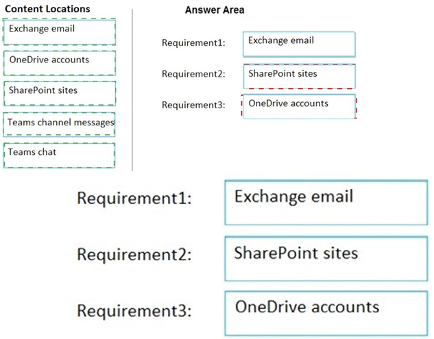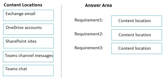 Which content location should you include in the retention policies? To answer, drag the appropriate content locations to the correct requirements. Each content location may be used once, more than once, or not at all. You may need to drag the split bar between panes or scroll to view content.