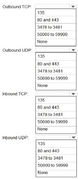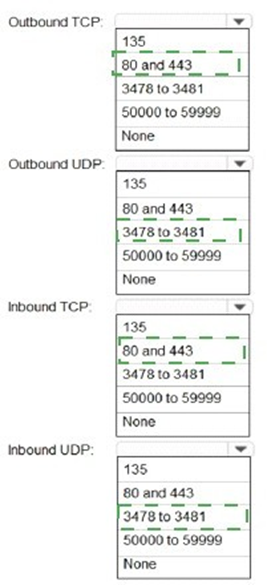 Which inbound and outbound ports should you recommend? To answer, select the appropriate options in the answer area.