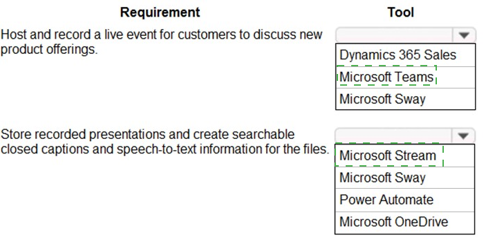 You need to select the Microsoft tool that the sales team should use for each requirement.