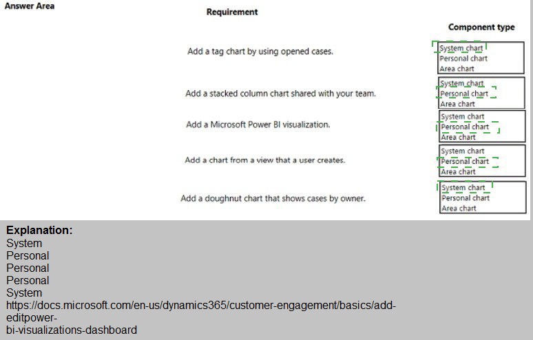 This question tests your understanding of dashboard component types in Dynamics 365/model-driven apps. Different chart types have different visibility and ownership scopes. System charts are available to all users, while personal charts are visible only to the user who created them. The requirements specify different sharing and ownership needs for each dashboard component.