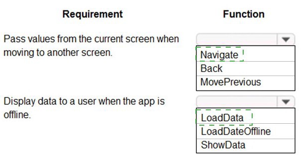 This question tests your knowledge of Power Apps canvas app functions for navigation and offline capabilities. The first requirement involves passing values between screens during navigation, which requires specific navigation functions. The second requirement involves displaying data when offline, which requires functions that can retrieve locally cached data from the device.