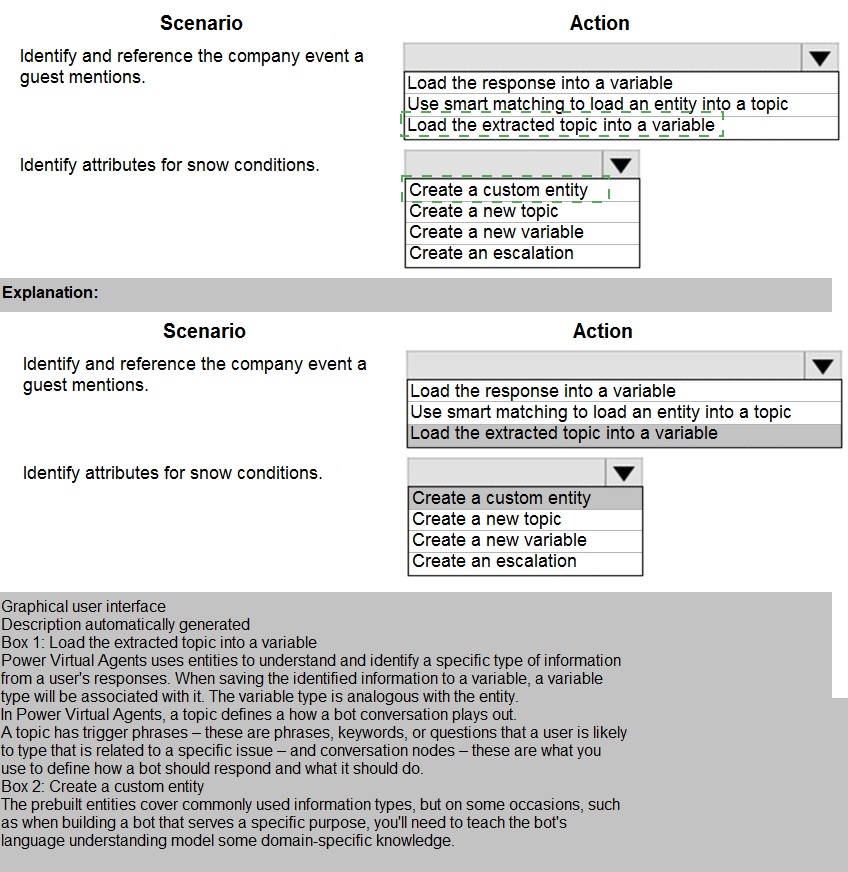 This question tests your ability to design a Power Virtual Agents chatbot solution that can handle two distinct types of user inquiries. The first scenario requires identifying and referencing a specific company event mentioned by the guest. The second scenario involves capturing attributes about snow conditions. Each requires different design approaches using entities, variables, and conversation flow techniques.