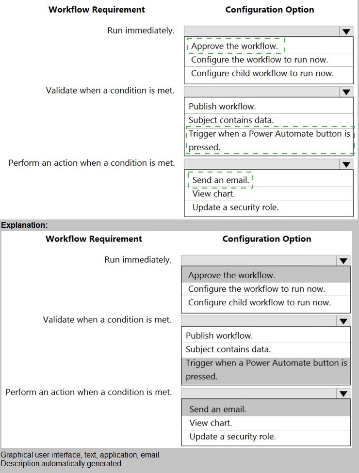 This question tests your knowledge of classic Dataverse workflow configuration options. Workflows in Dataverse can be configured to run immediately (real-time workflows) and include conditional logic. The requirements specify three distinct configuration elements: when the workflow executes, how conditions are evaluated, and what action occurs when conditions are met. Each needs the appropriate selection from the available options.