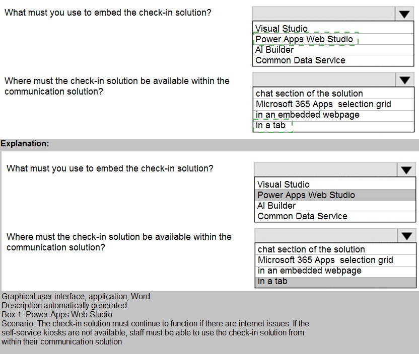 You need to embed the check-in solution into the communication solution. To answer, select the appropriate options in the answer area.NOTE: Each correct selection is worth one point