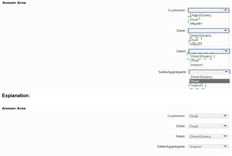 You need to select the storage modes for the tables. The solution must meet the following requirements: