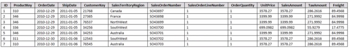 You are creating a sales report in Power Bl for the NorthWest region sales territory of your company. Data will come from a view in a Microsoft SQL Server database. A sample of the data is shown in the following table: