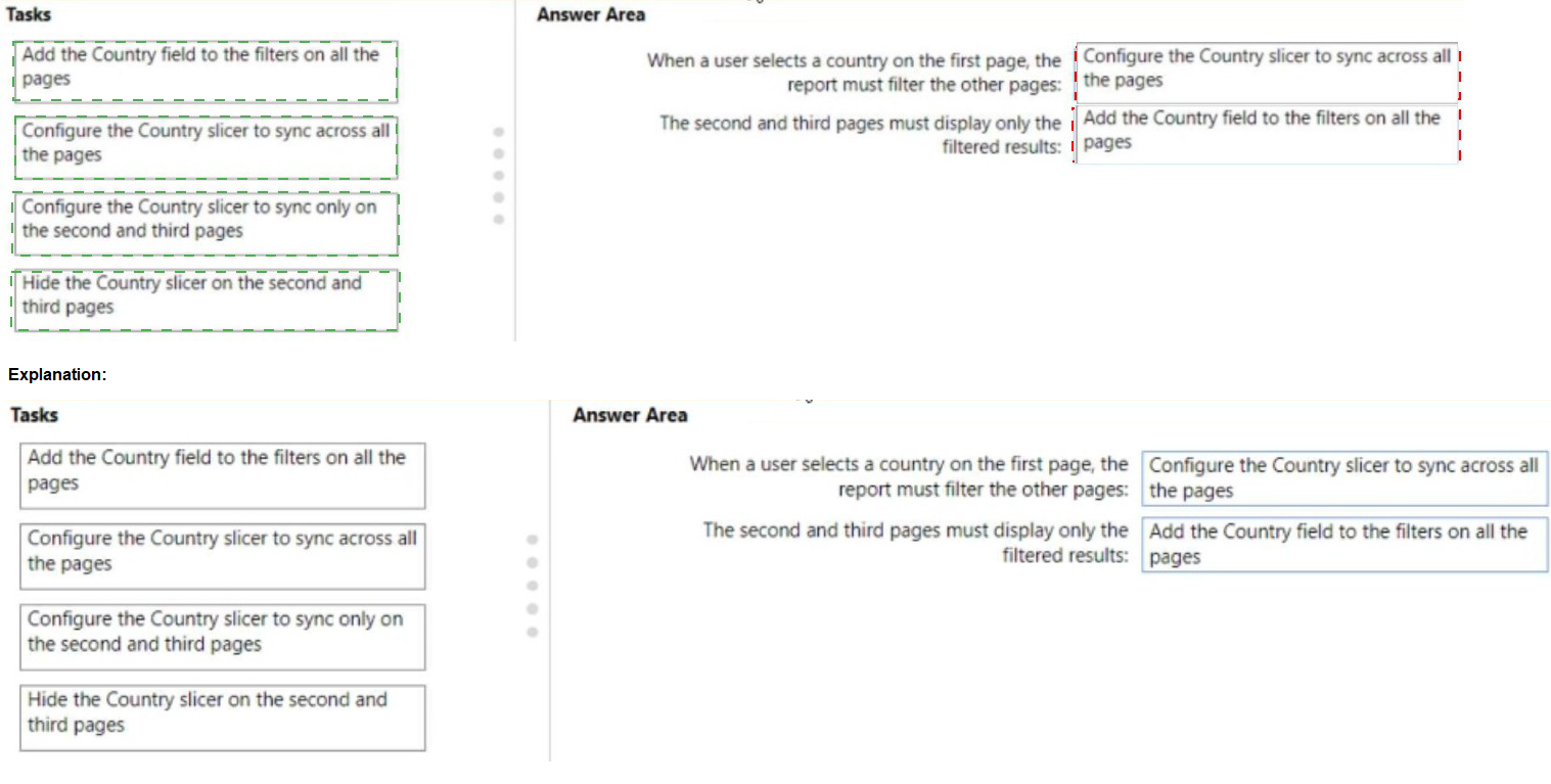 You have a Power Bl report that contains three pages. The pages are used to analyze sales across various countries.