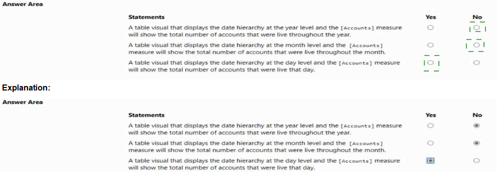 You have a Rawer Bl report That imports a dace table and a sales table from an Azure SQL database data source. The sales table has the following date foreign keys: