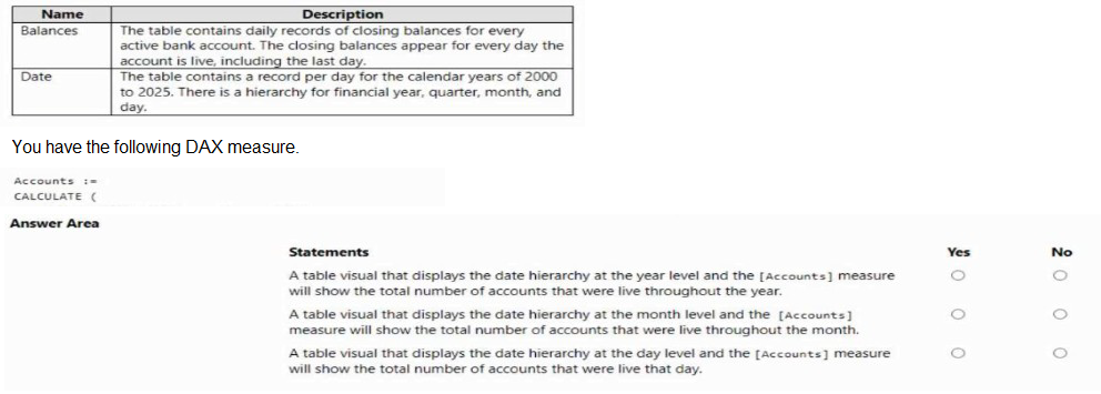 Solution: From the Fields pane, you rename the date table as Due Date. You use a DAX expression to create Order Date and Delivery Date as calculated tables. You create active relationships between the sales table and each date table.